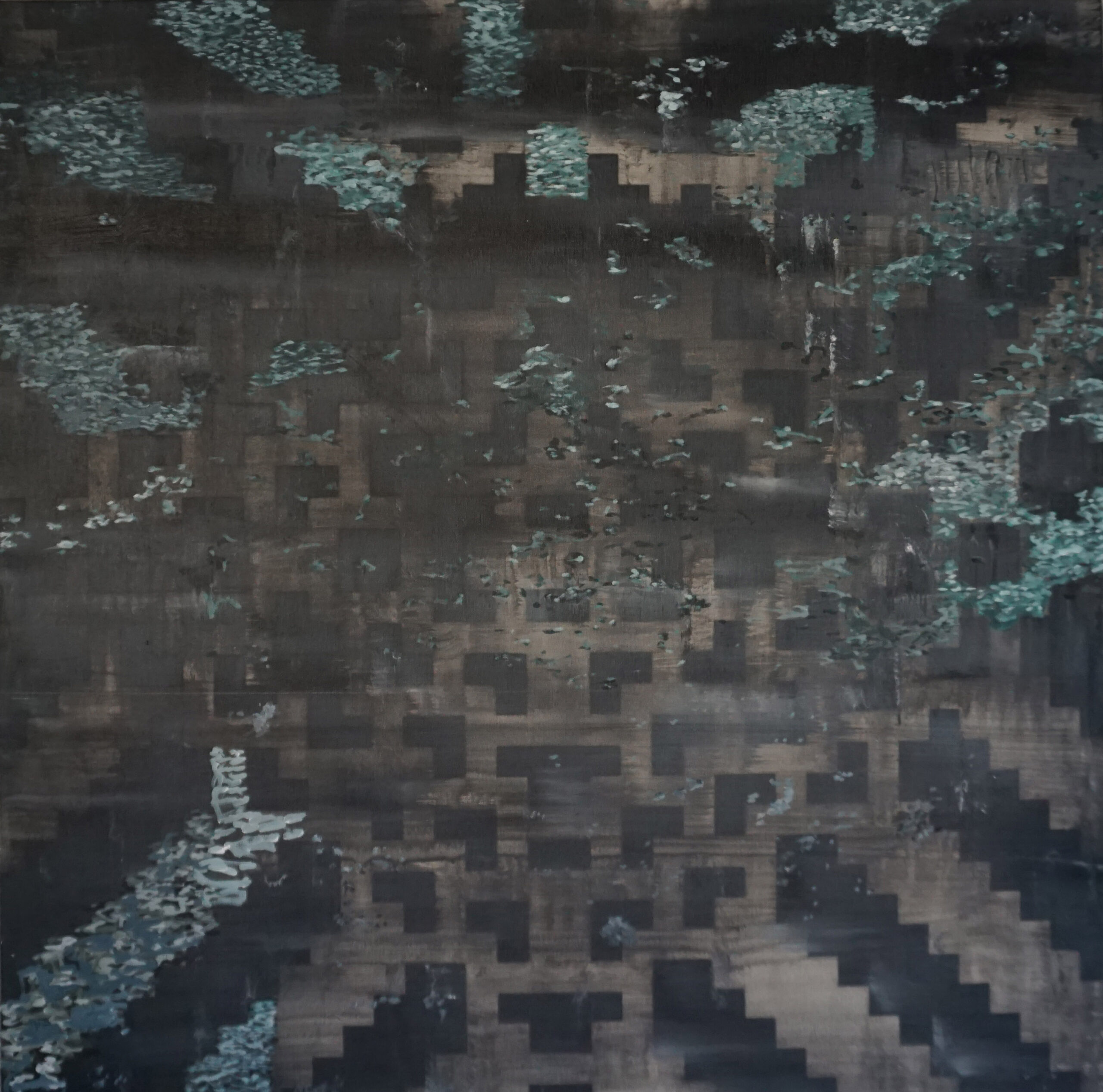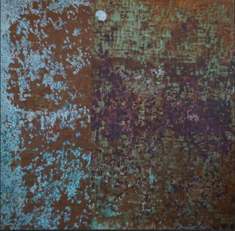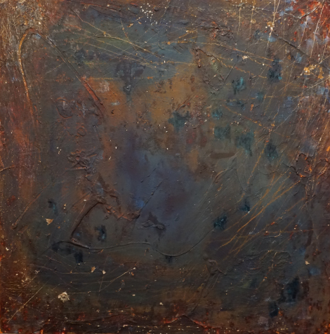 Oil, acrylic, oxidizing solution and cement on aluminium panel. 100 x 100cm